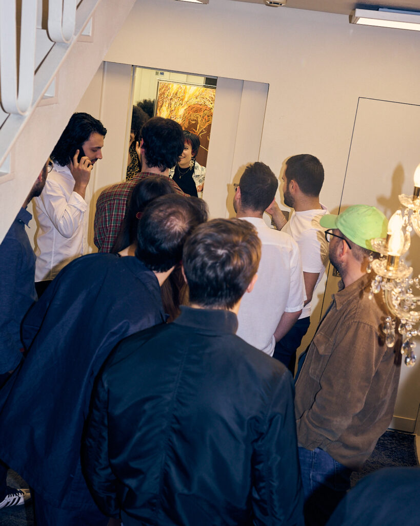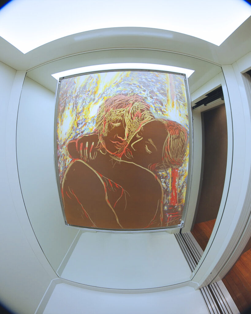La mostra si è svolta in un luogo del tutto insolito: l’ascensore di una casa privata, che per una notte è diventato uno spazio espositivo intimo e sospeso nel tempo. Protagonista un’unica tela dell’artista Matteo Capriotti, accompagnata da un percorso musicale, pensato per amplificare l’esperienza sensoriale e contemplativa della mostra.